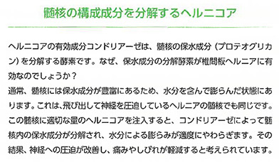 髄核には保水成分が豊富にあるため、ヘルニコアを髄核に注射することで、有効成分のコンドリアーゼが髄核内の保水成分を分解し水分によるふくらみを和らげます。結果として神経への圧迫が改善し、痛みや痺れなどの症状が軽減すると考えられています。